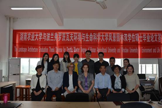 5月29日上午,波兰弗罗茨瓦夫环境与生命科学大学与湖南农业大学联合培养风景园林双硕士学位答辩在11教北624举行。中南林业科技大学沈守云教授担任答辩委员会主席,波兰弗罗茨瓦夫环境与生命科学大学 Irena Niedzwiecka-Filipiak教授、 Marta Weber-Siwirska副教授及我校龙岳林教授、甘德欣教授、周晨副教授担任答辩委员会成员。申请答辩的有刘婷等8名学生。经过PPT汇报、专家提问,综合学生四个学期课程成绩以及答辩成绩,最终确定此次参与答辩的8名学生全部通过并将获取弗罗茨瓦夫环境与生命科学大学风景园林学硕士学位。本次毕业答辩将对推进我校与波兰联合培养双硕士风景园林研究生有着积极的重要意义,为后续更深入广泛的合作奠定良好的基础。